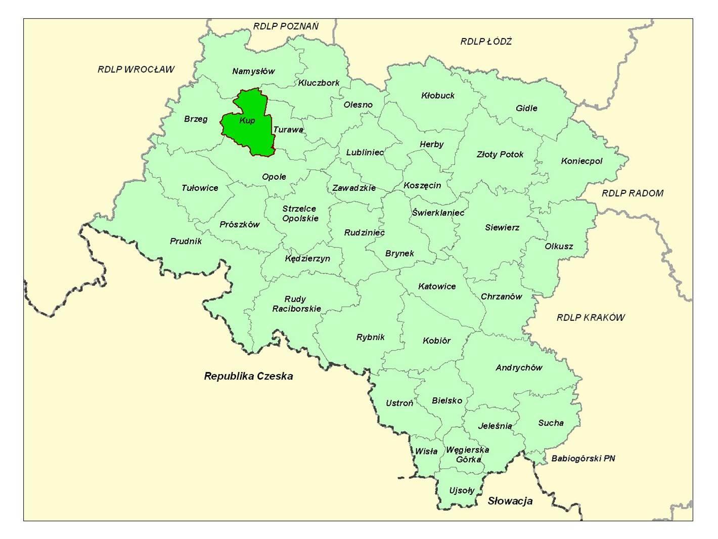 Położenie Nadleśnictwa Kup w ramach Regionalnej Dyrekcji Lasów Państwowych w Katowicach